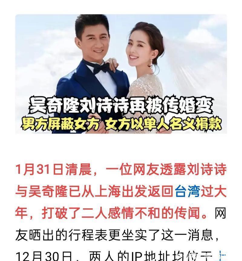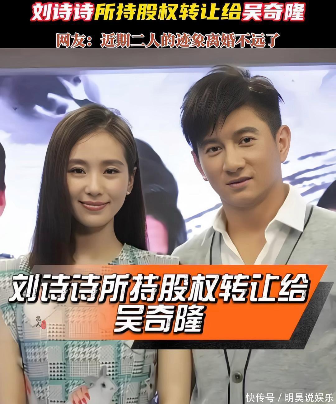 还有一些细节也被网友拿出来看成婚变的佐证。比如在吴奇隆的酬酢平台中,他和刘诗诗的互动实质停留在了 2019 年,刘诗诗的酬酢平台上早已莫得吴奇隆干系实质,况且刘诗诗还屡次摘掉婚戒,而吴奇隆近期还戴着婚戒。此外刘诗诗前不久把我方名下公司的股份全部转让给吴奇隆,两东谈主名下共同的公司也如故刊出,这些行动齐被一些东谈主认为是仳离的前兆。